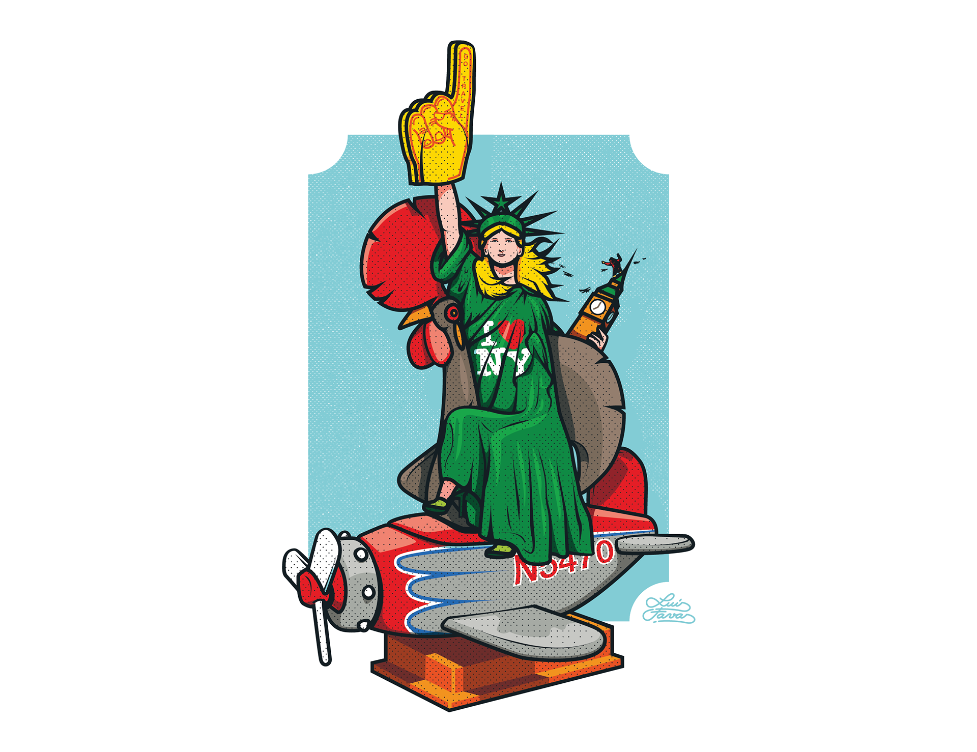 1 – Instead of the torch, Liberty has a foam baseball glove with the text "Go Travel".